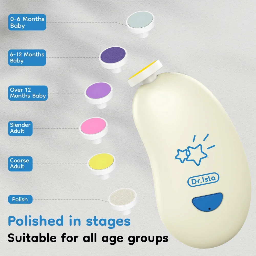 The Electric Baby Nail Trimmer is designed to help parents safely and gently trim their baby’s nails without fear of cuts or scratches. Equipped with a built-in LED light, it provides clear visibility for nighttime or low-light grooming sessions. The set includes 6 replaceable polishing heads, each designed for different ages and nail types, ensuring smooth and painless trimming for newborns, infants, and toddlers. Its low-noise motor keeps babies calm, allowing you to use it even while they sleep. With gentle rotation, the trimmer safely files nails without damaging delicate skin. The compact and lightweight design makes it easy to hold and operate with one hand. Made from baby-safe, durable materials, this grooming tool is perfect for everyday use. The multi-functional heads allow filing, polishing, and shaping for a neat finish. Ideal for home use or travel, it helps maintain clean and smooth nails, preventing accidental scratches. The storage case keeps all attachments organized and clean. This trimmer is a must-have tool for parents looking for a safer, easier, and more comfortable way to care for their baby’s nails.