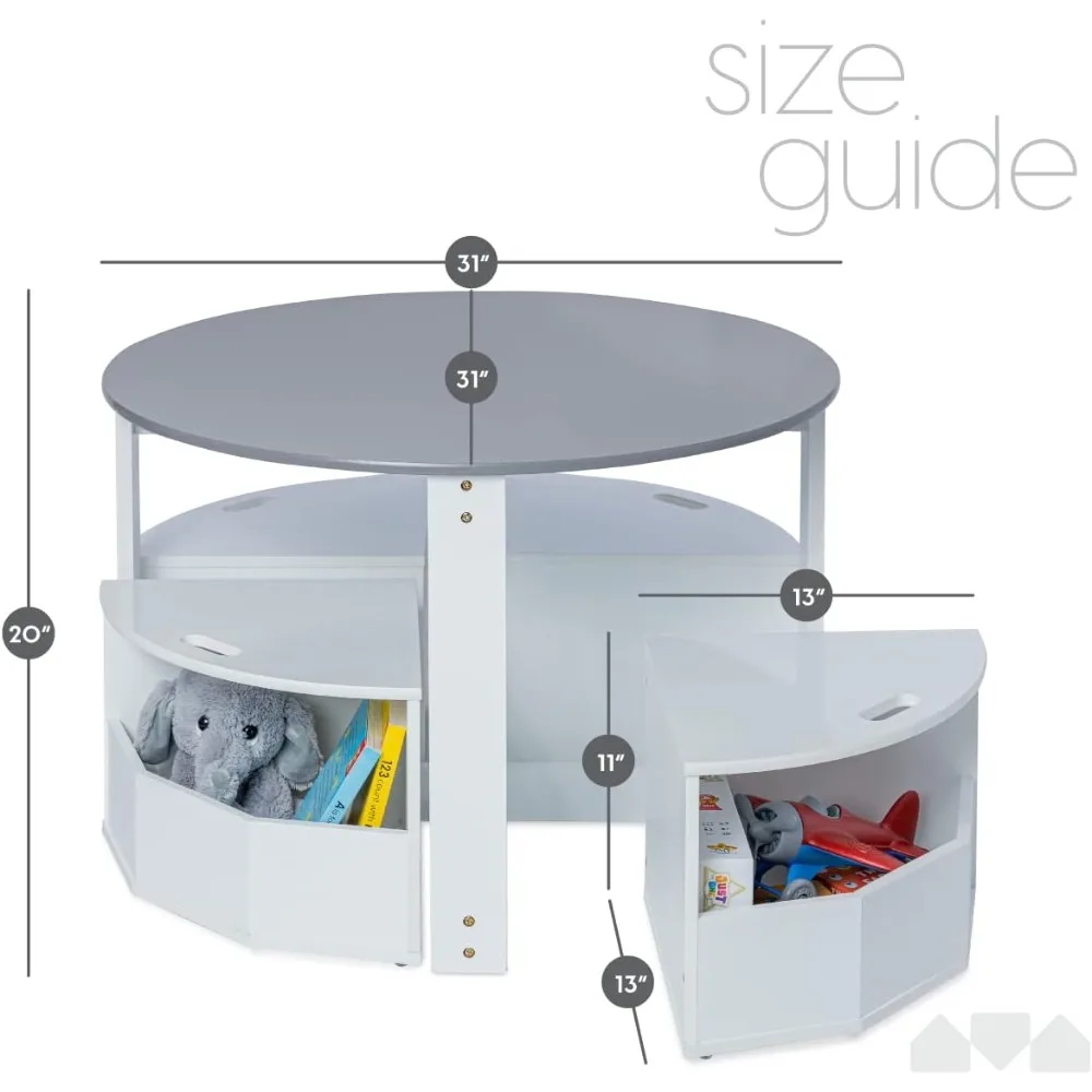 The Round Kids Activity Table is designed to create a fun, organized, and comfortable space for toddlers and young children. This set includes a round table and four matching storage stools, perfect for playtime, learning, and social activities. The nesting design allows the stools to slide neatly under the table, helping save space and keep rooms tidy. Its child-friendly height supports proper posture for drawing, reading, crafts, and games. The rounded edges enhance safety, making it suitable for everyday toddler use. Each stool doubles as hidden storage, providing a smart solution for toys, books, and art supplies. The sturdy construction ensures stability while remaining lightweight enough for easy movement. Ideal for playrooms, bedrooms, nurseries, or classrooms, it adapts easily to different environments. The spacious tabletop offers plenty of room for group activities and creative play. Easy to assemble and maintain, it’s designed with busy families in mind. This table set encourages independence, creativity, and cooperation among children. A practical and stylish furniture choice that combines play, storage, and space-saving convenience in one smart design.